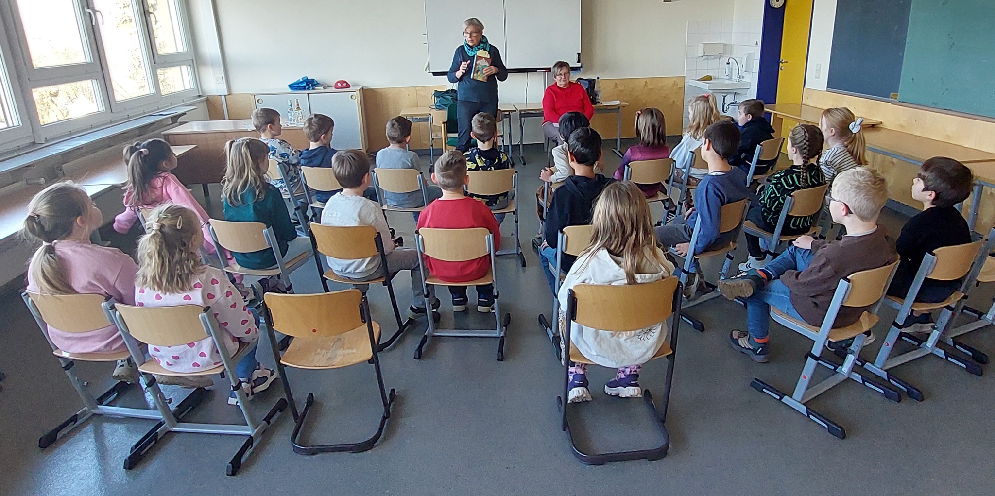 Für die Klassenstufe 2 hatten sich Frau Struwe und Frau Wagner von der Initiative 55+ die Zeit genommen, um den Kindern aus dem ersten Band von „Die Schule der magischen Tiere“ vorzulesen. Durch ihren lebhaften und kurzweiligen Vortrag auch in verteilten Rollen fesselten sie die jungen Zuhörer. Der Höhepunkt war, als zwei Kinder, wie im Buch beschrieben, einen geschlossenen Karton erhielten und darin jeweils eines der magischen Tiere fanden. So verging die Zeit rasend schnell und die Zuhörer belohnten die Vorleserinnen mit Applaus.