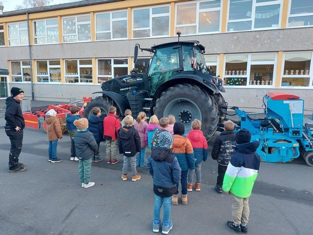 So brachte sich die Landjugend aktiv ein und brachte für die Erstklässler extra einen Traktor samt Sähmaschine mit, welche als Highlight ausgiebig auf dem Pausenhof erkundet werden konnte. Passend dazu wurde die Geschichte „Entdecke mit uns den Bauernhof“ vorgelesen. Neben diesem Buch, das die Erstklässler geschenkt bekamen, erhielt jedes Kind ein Tütchen mit Weizenkörnern, was das Erlebnis abrundetet.